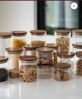 GRAND LOT DE 16 BOITE DE RANGEMENT EN VERRE AVEC COUVERCLE EN BOIS D’ACACIA